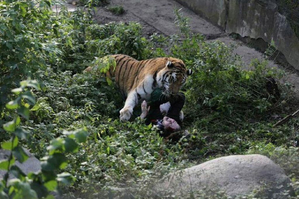 A Siberian tiger pinned the handler who was bringing it food, biting and clawing at her.